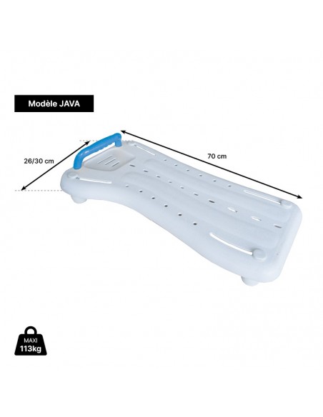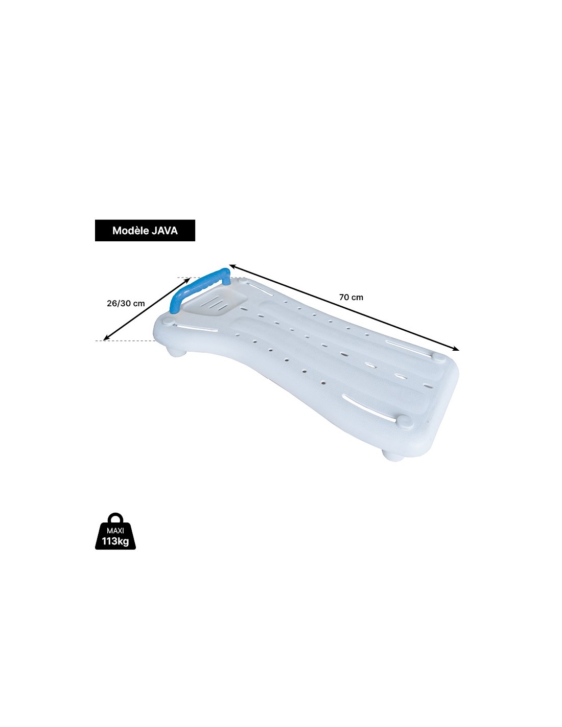 La planche de bain Java est conçue pour offrir une solution pratique et sécurisante aux personnes souhaitant prendre leur douche confortablement installées dans leur baignoire.